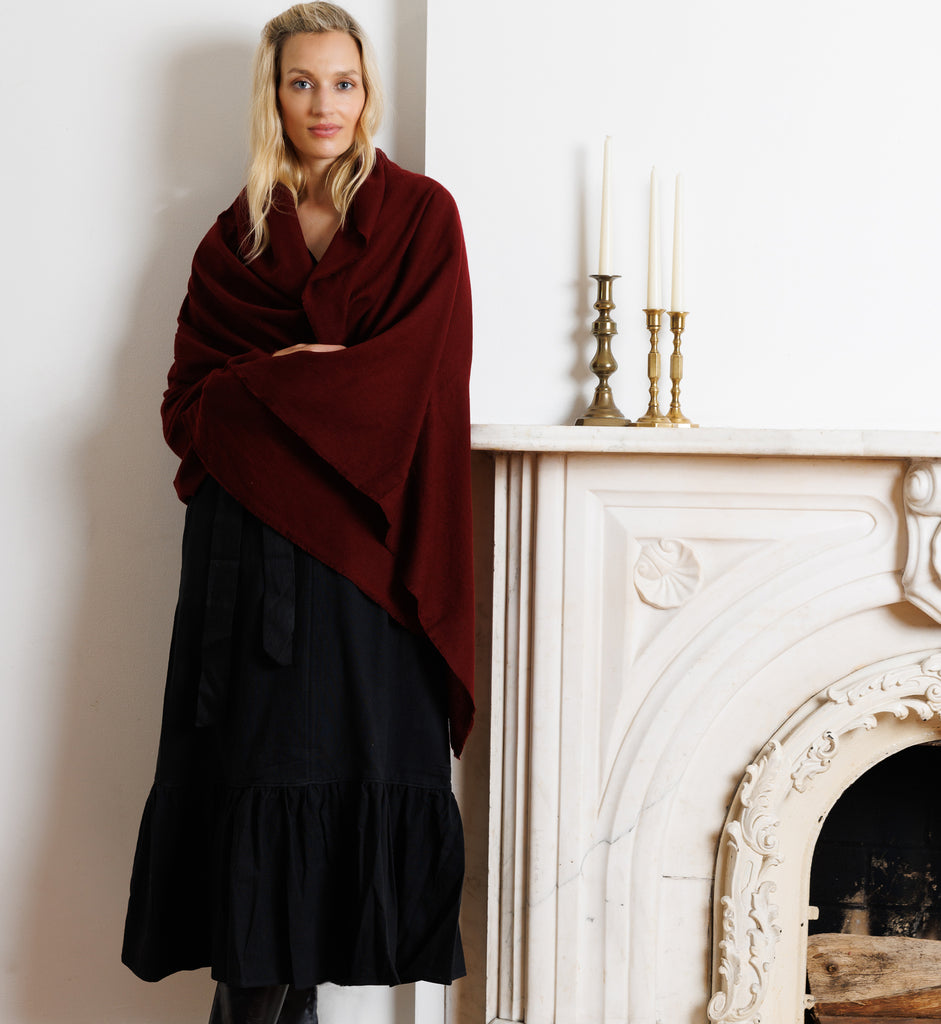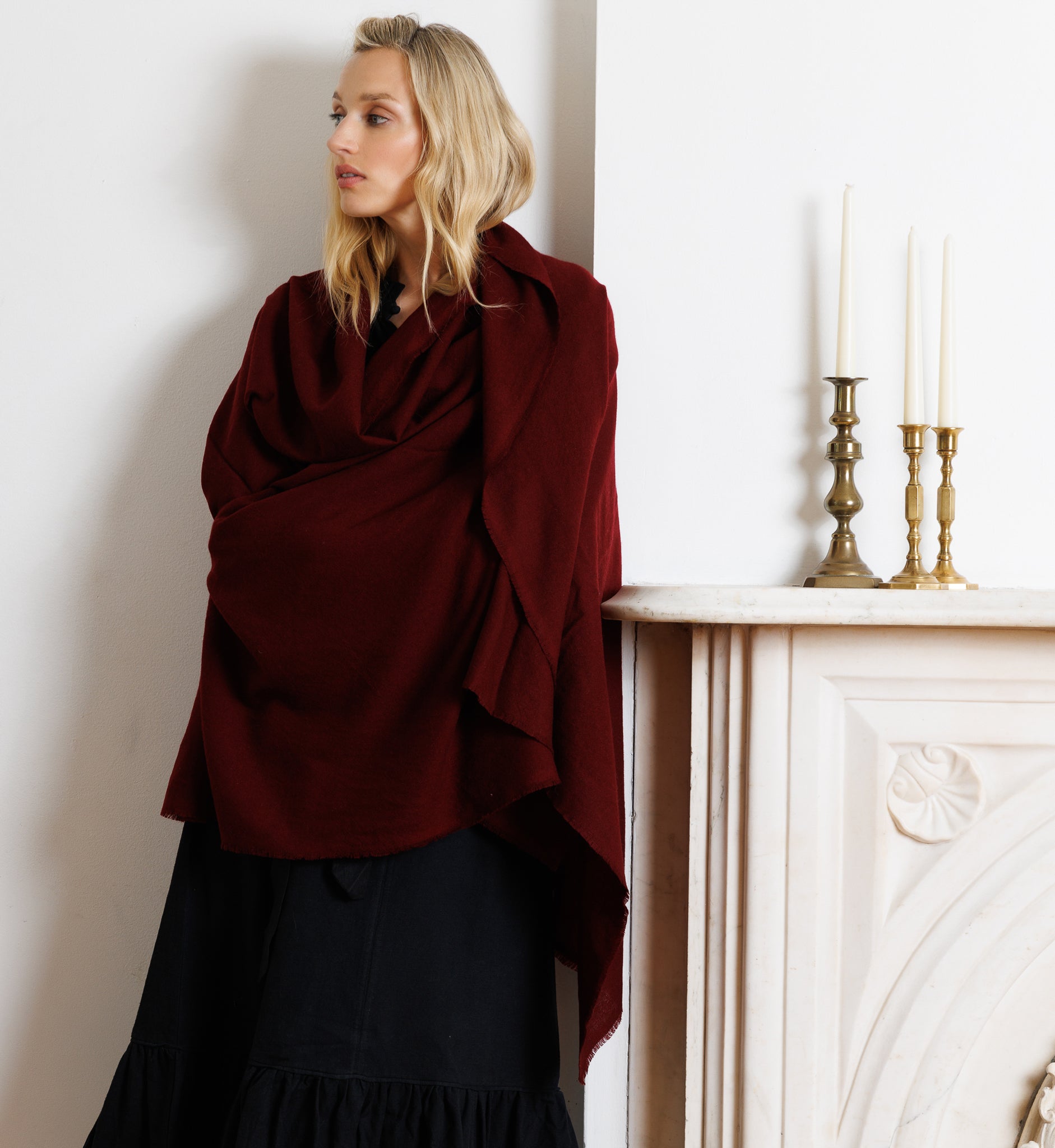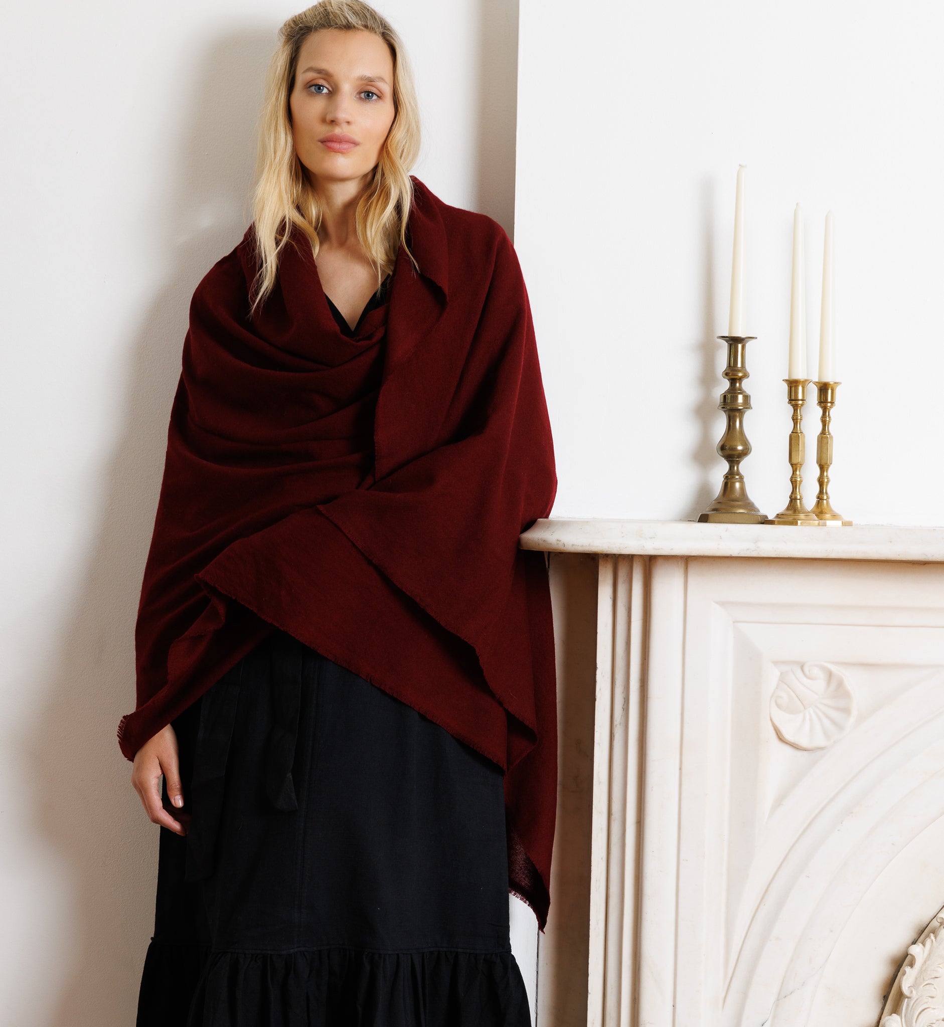 One of our best selling colors: so versatile, rich and classic. Our Alexandra Wrap in Merlot has a delicate fringe on every side and the deep red color is beautiful with navy, black, camel and grey. We love this medium weight cashmere wrap as a travel companion and with a heather grey wool blazer or cardigan during colder months. 100% cashmere. 81" x 39." Made in Nepal.